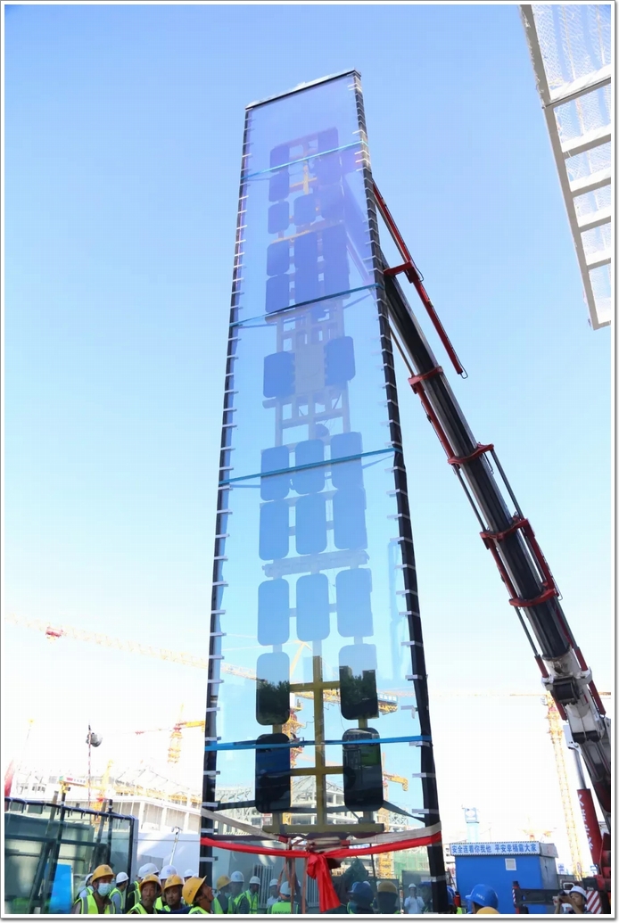 而在中建深装负责的施工标段,2021年10月11日,也完成了首款超大幕墙玻璃的挂装工作。
